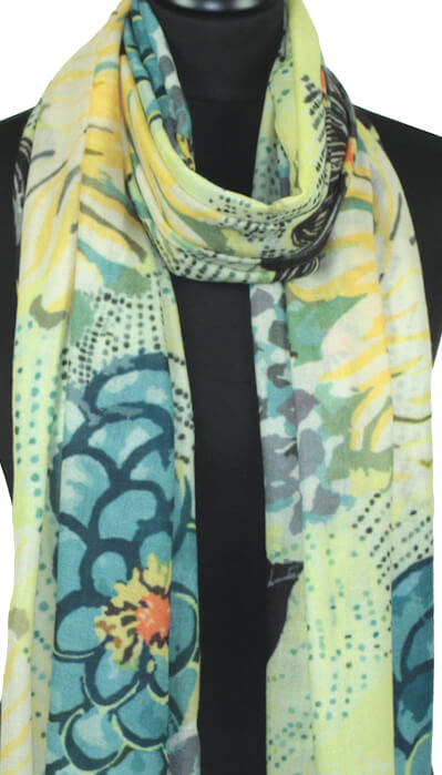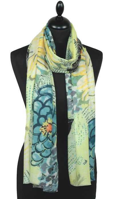 Cashmere Scarf "Azure Flowers”, in shades of blue, yellow and green, evoking the freshness of Mediterranean gardens bathed in sunlight.