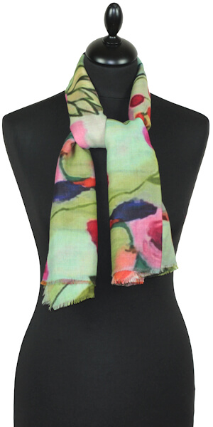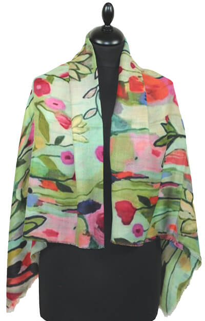 Carré en Laine « Fleurie », aux tons rose, vert et noir, inspirée par un bouquet éclatant de fleurs sauvages, symbole de fraicheur et de gaieté.