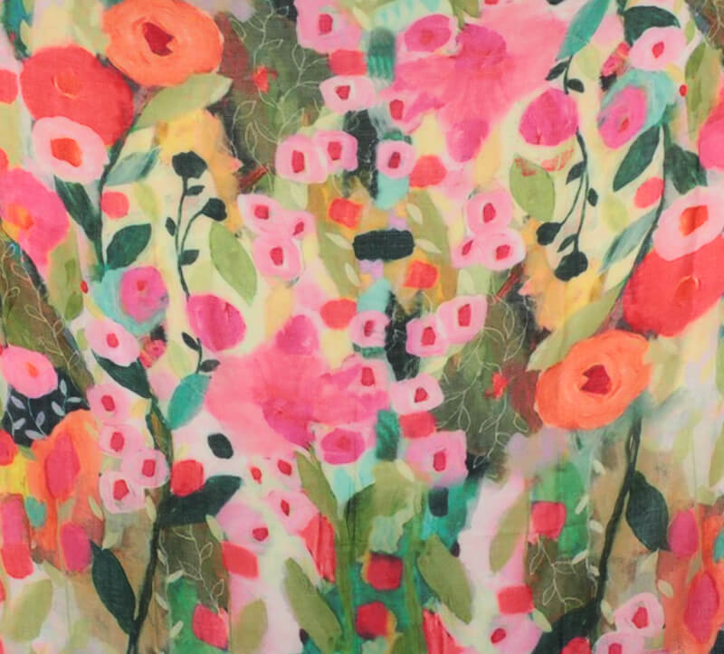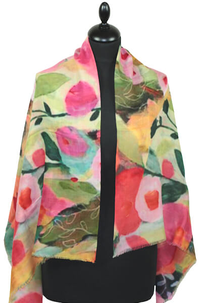 Carré en Laine « Jardin des Rêves », aux tons tendres de rose, corail et vert, inspirée par un jardin imaginaire en fleurs, symbole de douceur, de féminité et d’harmonie.