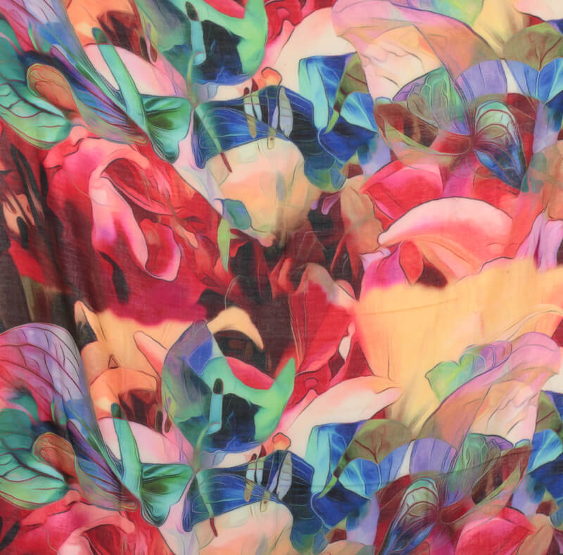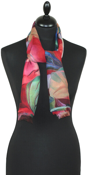 « Jardin d’Été », aux tons rouge, bleu et vert, inspirée par la fraîcheur, la gaieté et l’élégance d’un bouquet estival.