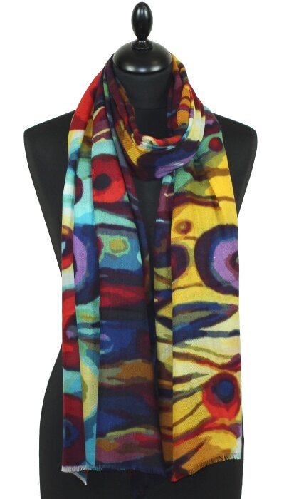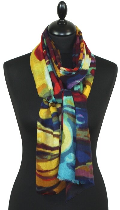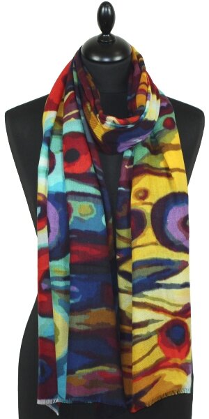 Cette écharpe en cachemire, colorée aux tons rouge, or et bleu allie douceur, légèreté et chaleur, ce qui en fait l'accessoire idéal pour sublimer vos tenues et y ajouter une touche de gaieté.