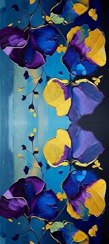 Écharpe Cachemire « Jardin de Brume », aux tons violet, bleu et jaune, un motif floral éthéré comme enveloppé dans une douce rosée matinale.