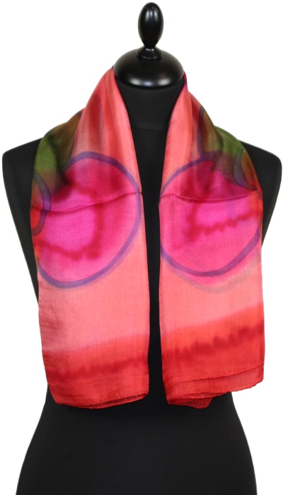 Ce foulard carré en soie peinte à la main aux couleurs corail, fuchsia et vert combine à la perfection élégance et confort. D'une douceur incomparable, il est à la fois léger et chaud, vous offrant un confort optimal tout au long de l'année.